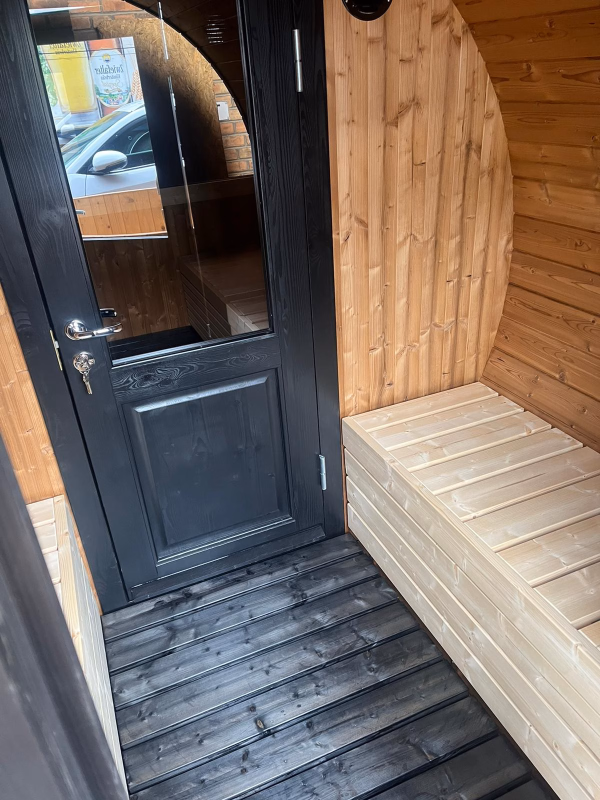 This outdoor sauna is made of high quality thermo-processed spruce wood. The sauna has two sections with enough room for up to 6-8 people. Total length 4,10 meters, diameter 2,05 meters. Steam room length 2,20 meters and front room length 1,20 meters. Designed to be used by people of any age and at any time.