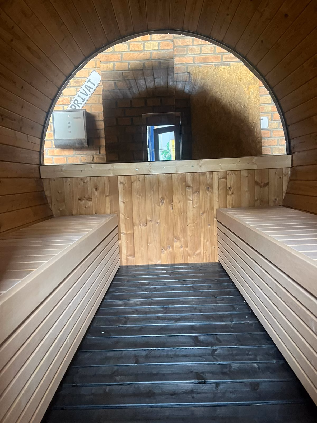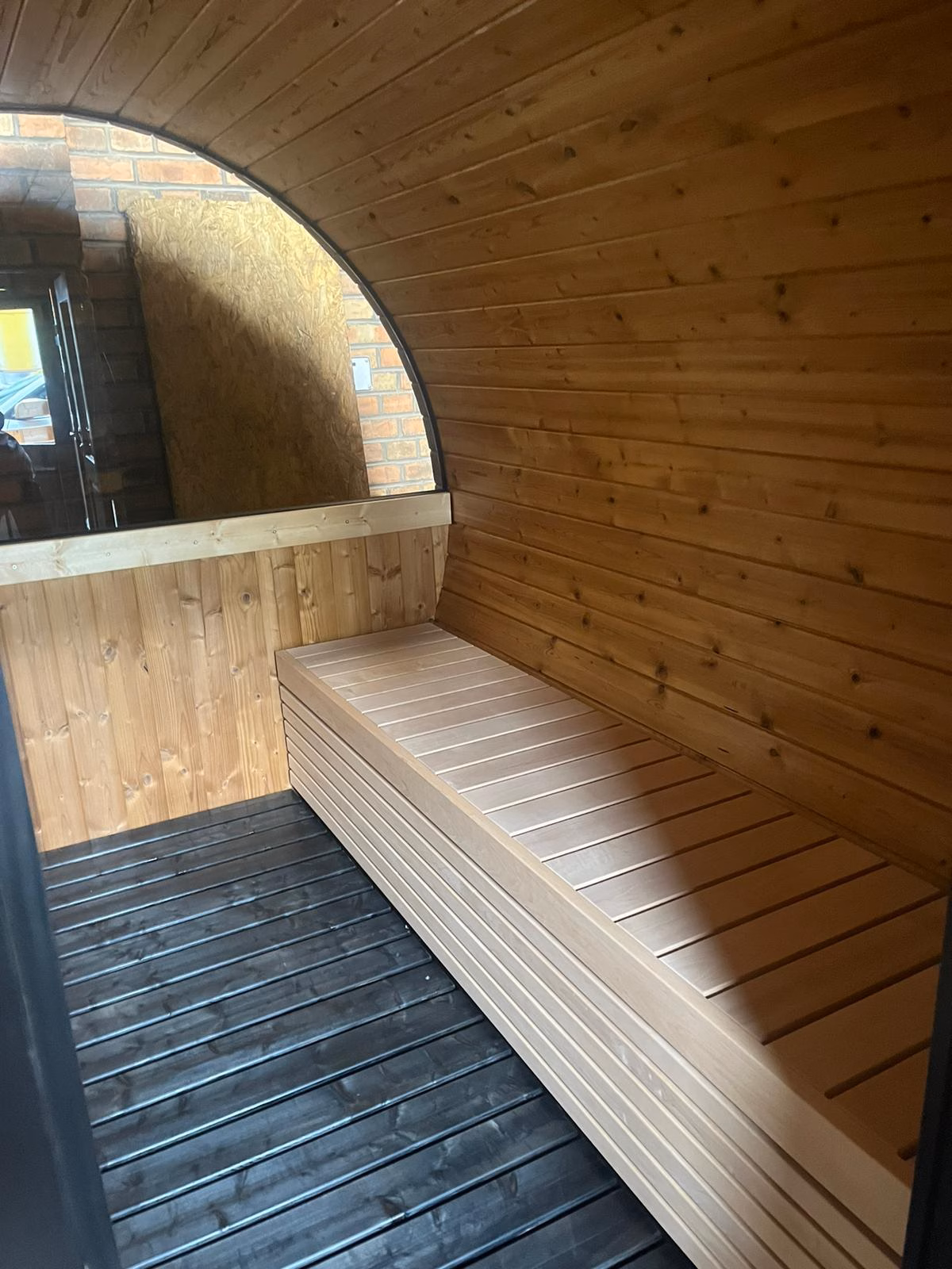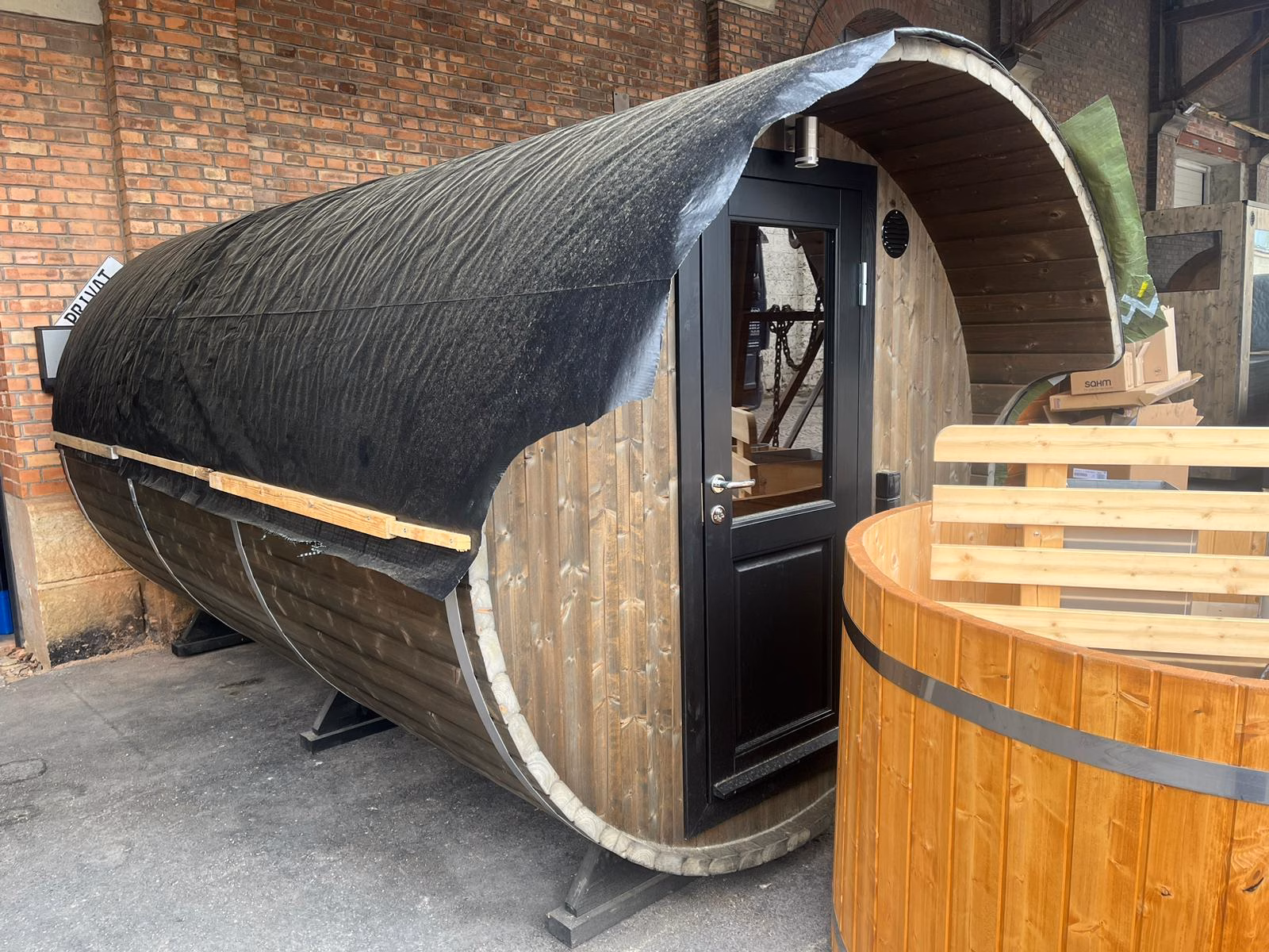 * Wooden barrel sauna (diameter ca 2,05 m, height 2,20 m, length 4,10 m)